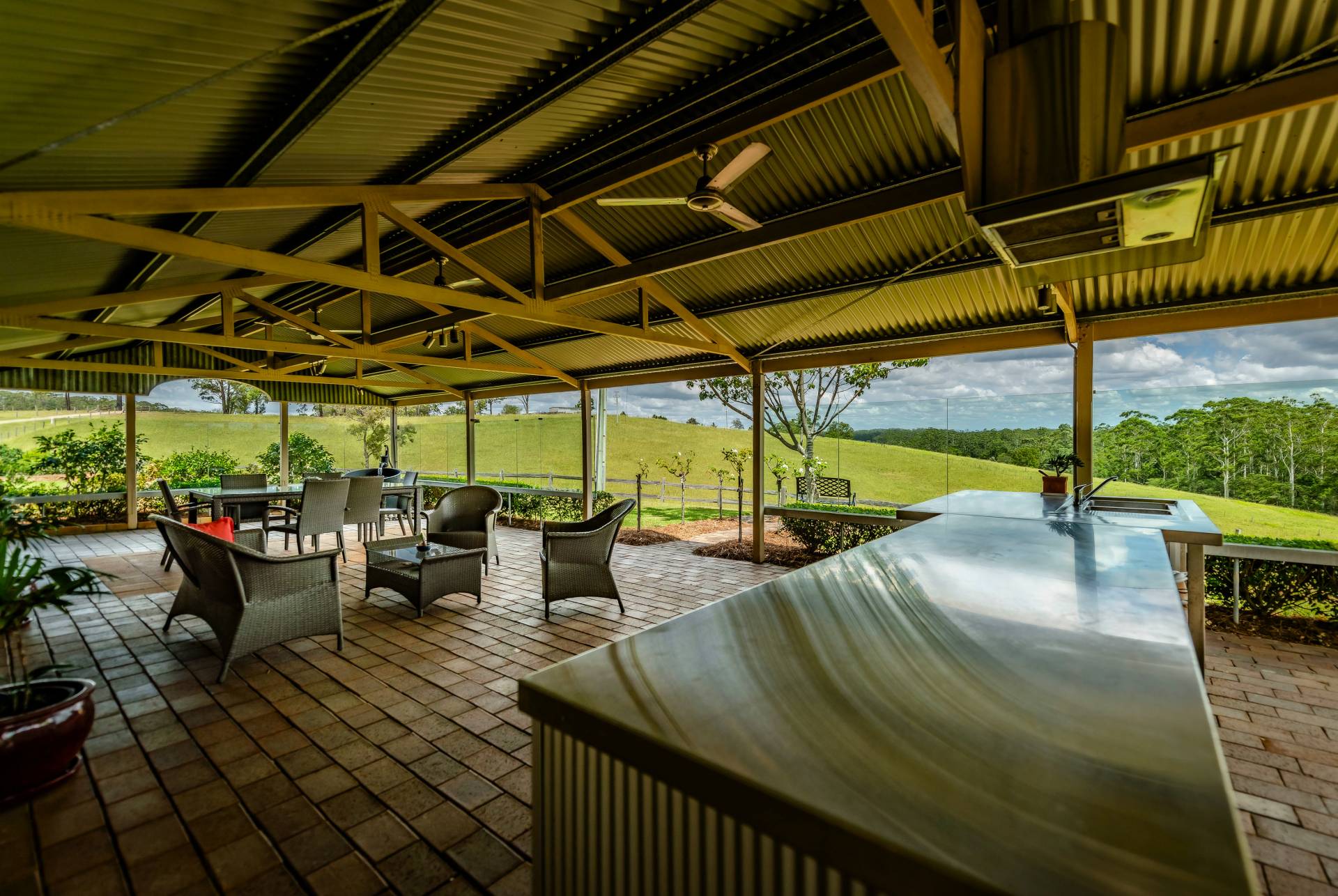 • Fully covered outdoor barbecue area with sink and stainless steel bench, lighting, overhead fans  and dining area.