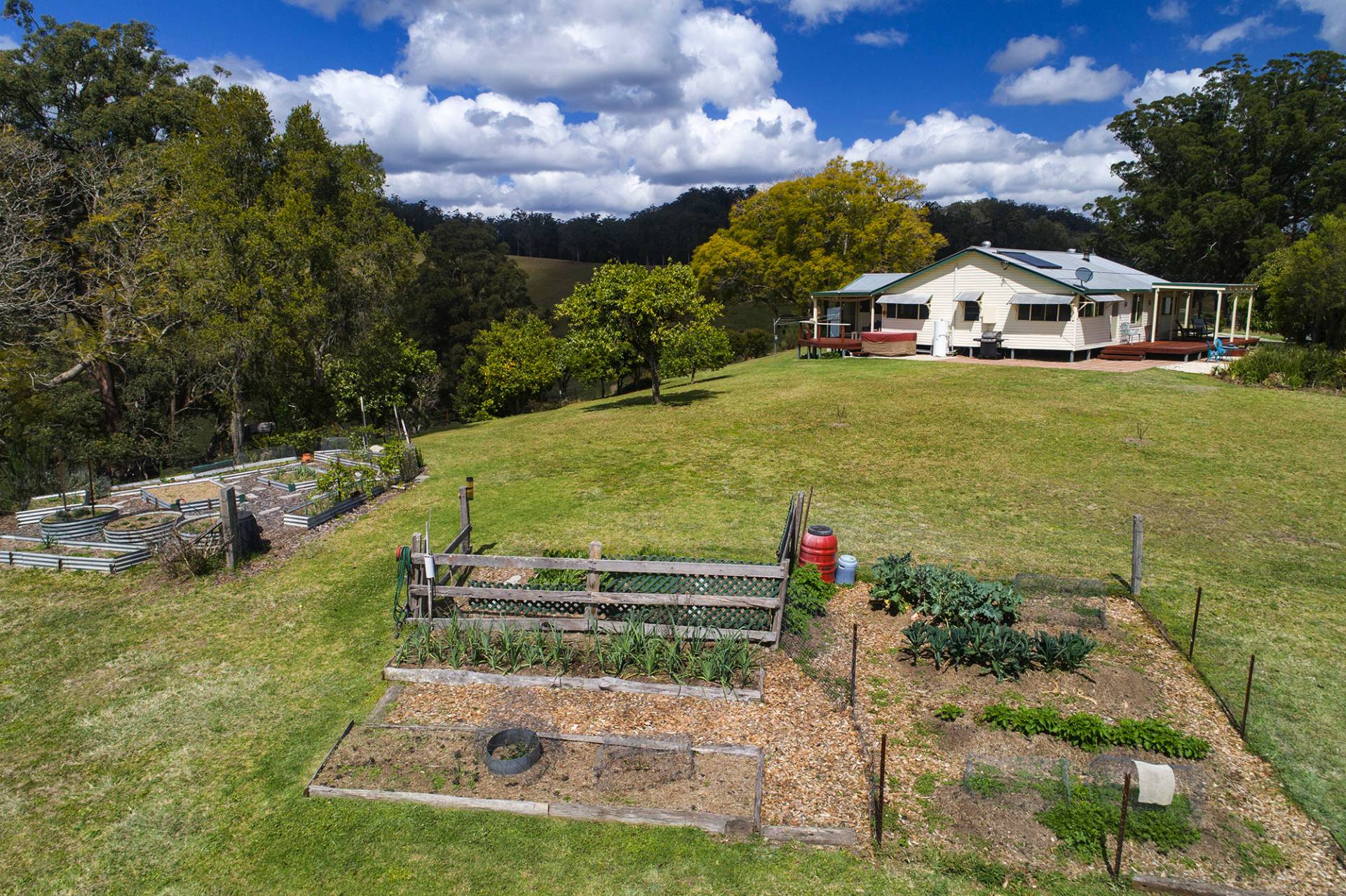 The established gardens contain a variety of fruit and nut trees including Citrus, Mango, Guava, Fig, Olive, Finger lime and Macadamia. There is also a well stocked veggie garden with numerous raised beds.