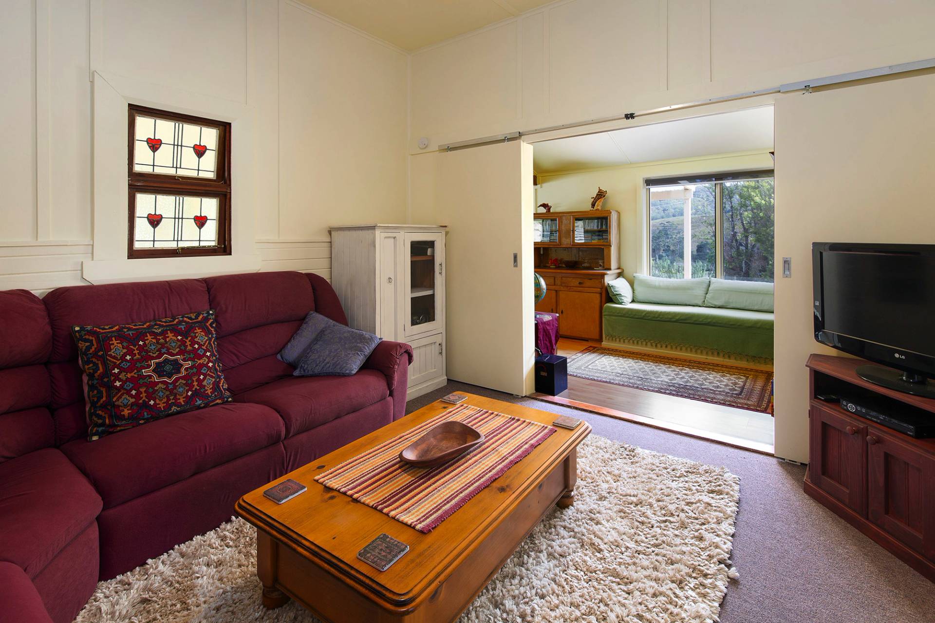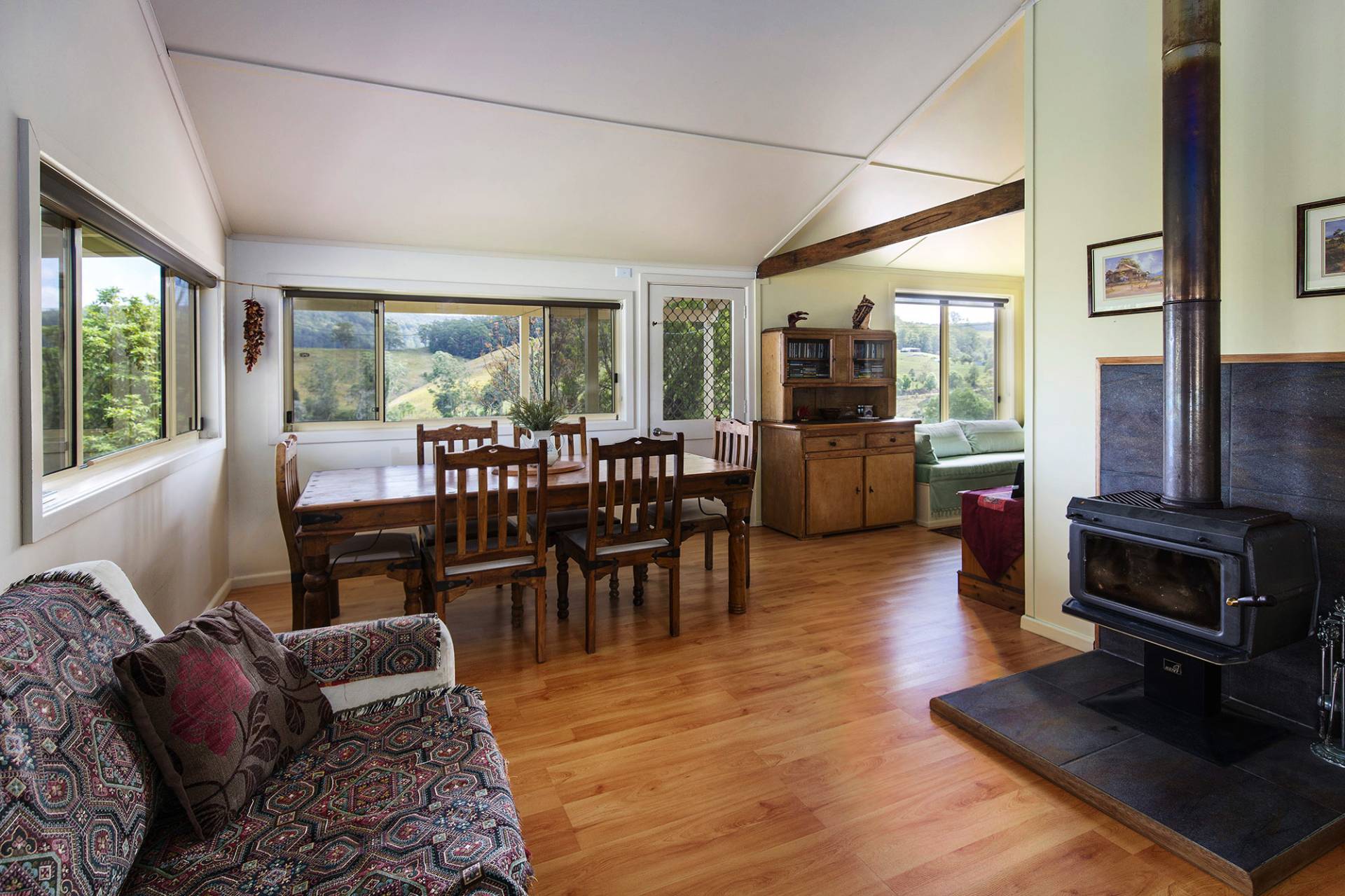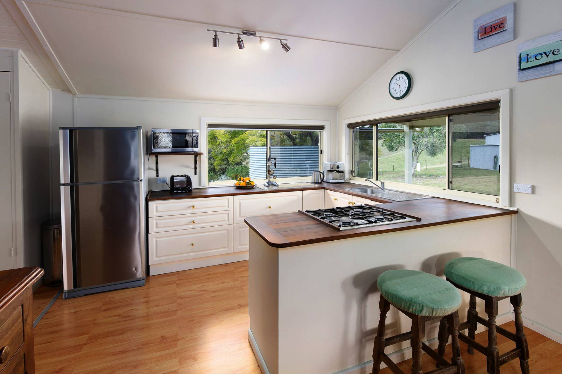 This charming and unique 3-bedroom homestead (2 double bedrooms plus 3rd bedroom / study) has been stylishly renovated to retain its historic character and is wonderfully situated to appreciate the panoramic rural views, with both front and back verandas enjoying afternoon cooling coastal breezes. Modern comforts include a slow combustion wood burner for those cosy nights in, ceiling fans and air-conditioning for those warm summer days, solar hot-water, and a hot tub to relax and unwind in under the stars.