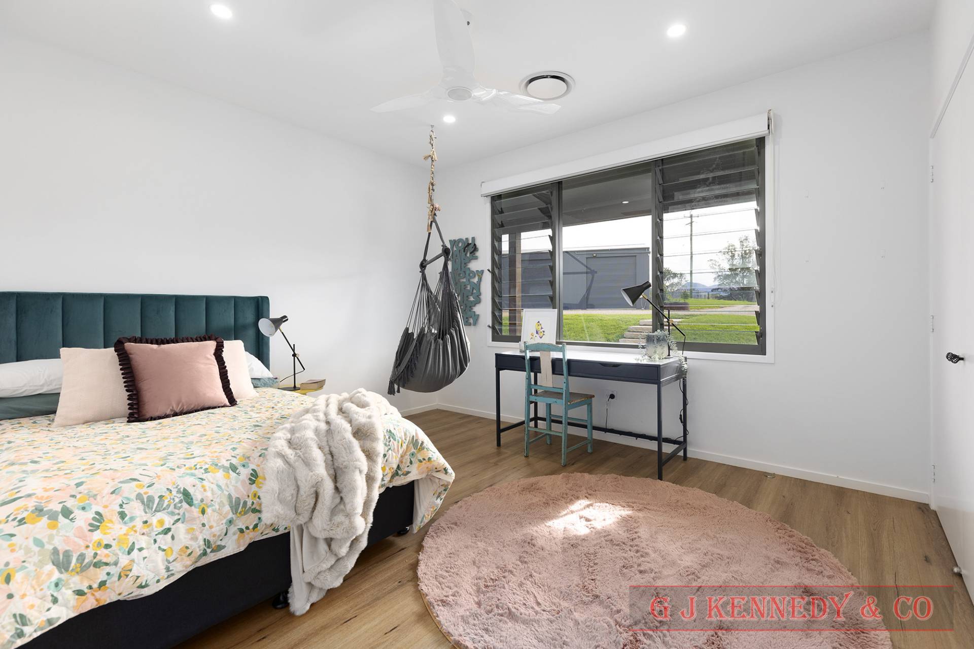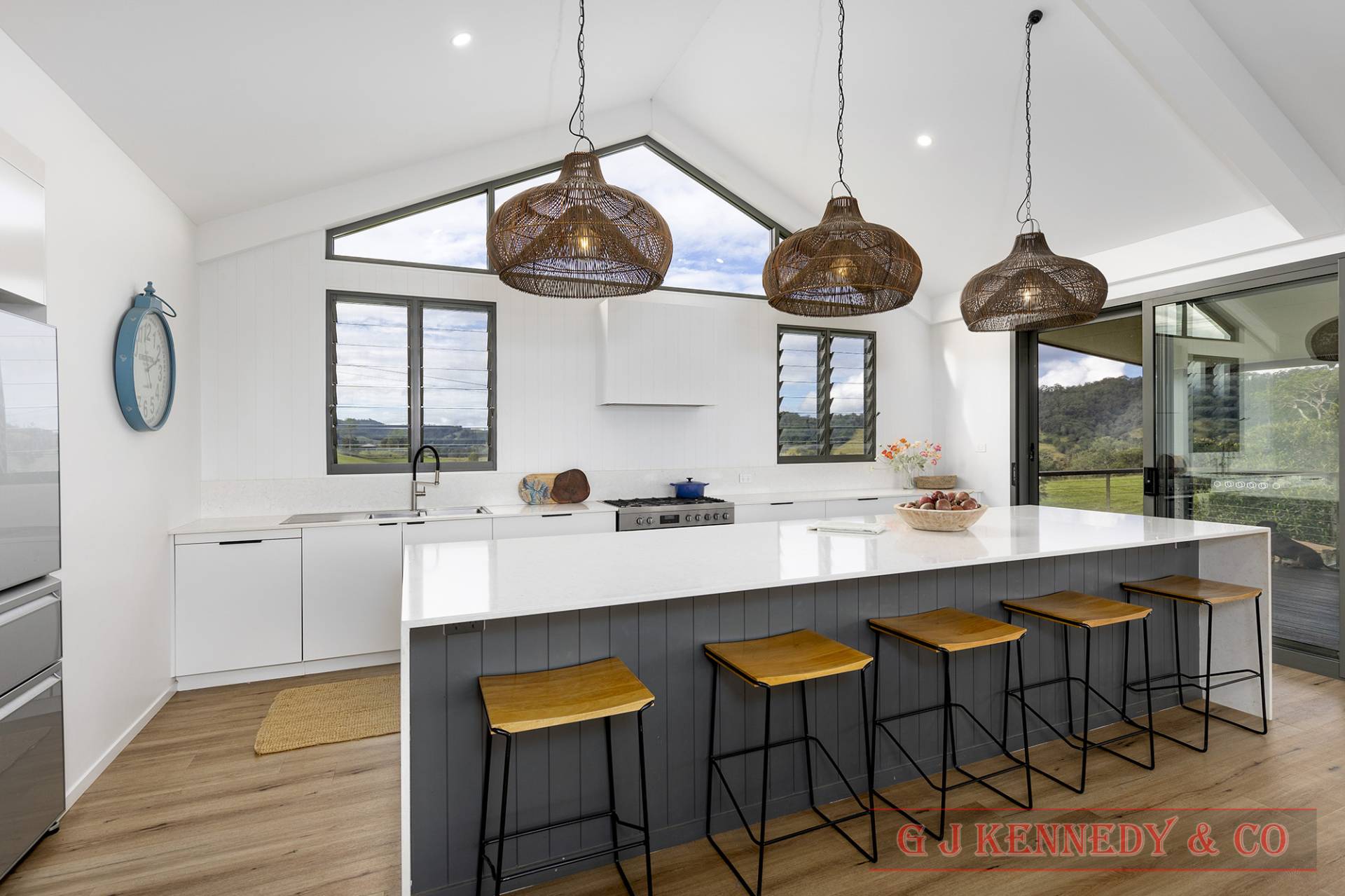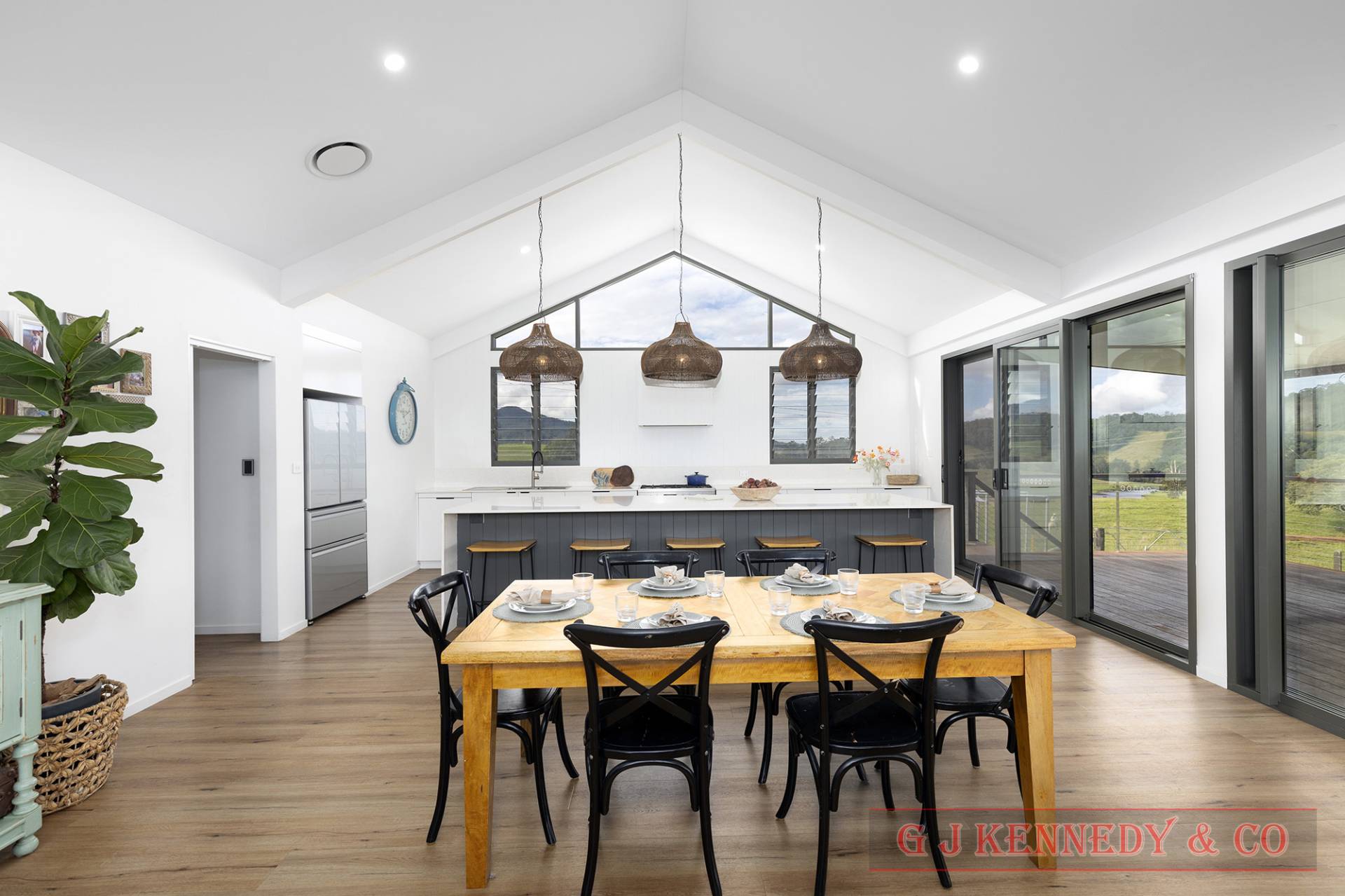 • Open-plan living with vaulted ceilings and feature windows.
