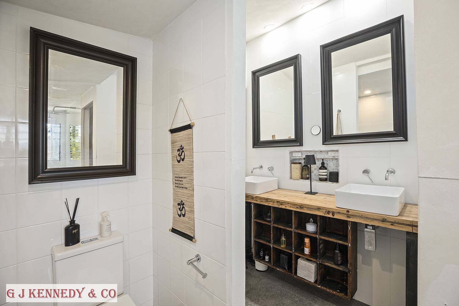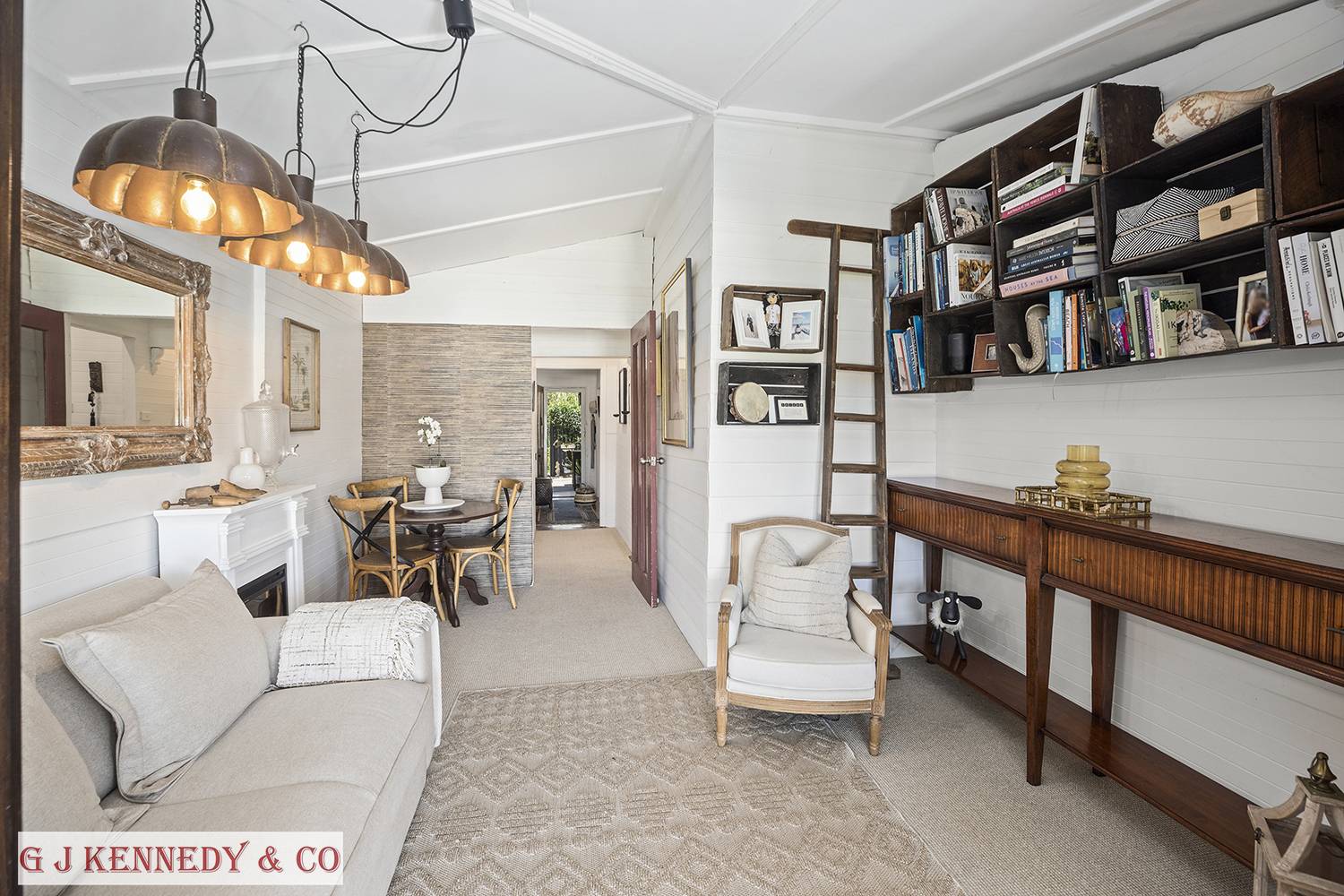 A lounge area equipped with a delightful original open fireplace, opens to the spacious kitchen area with timber benches, porcelain sinks and dishwasher in the adjacent butler’s pantry. There is ample storage with induction cooking, oven and including an original Bega 3 wood fired stove with flu.