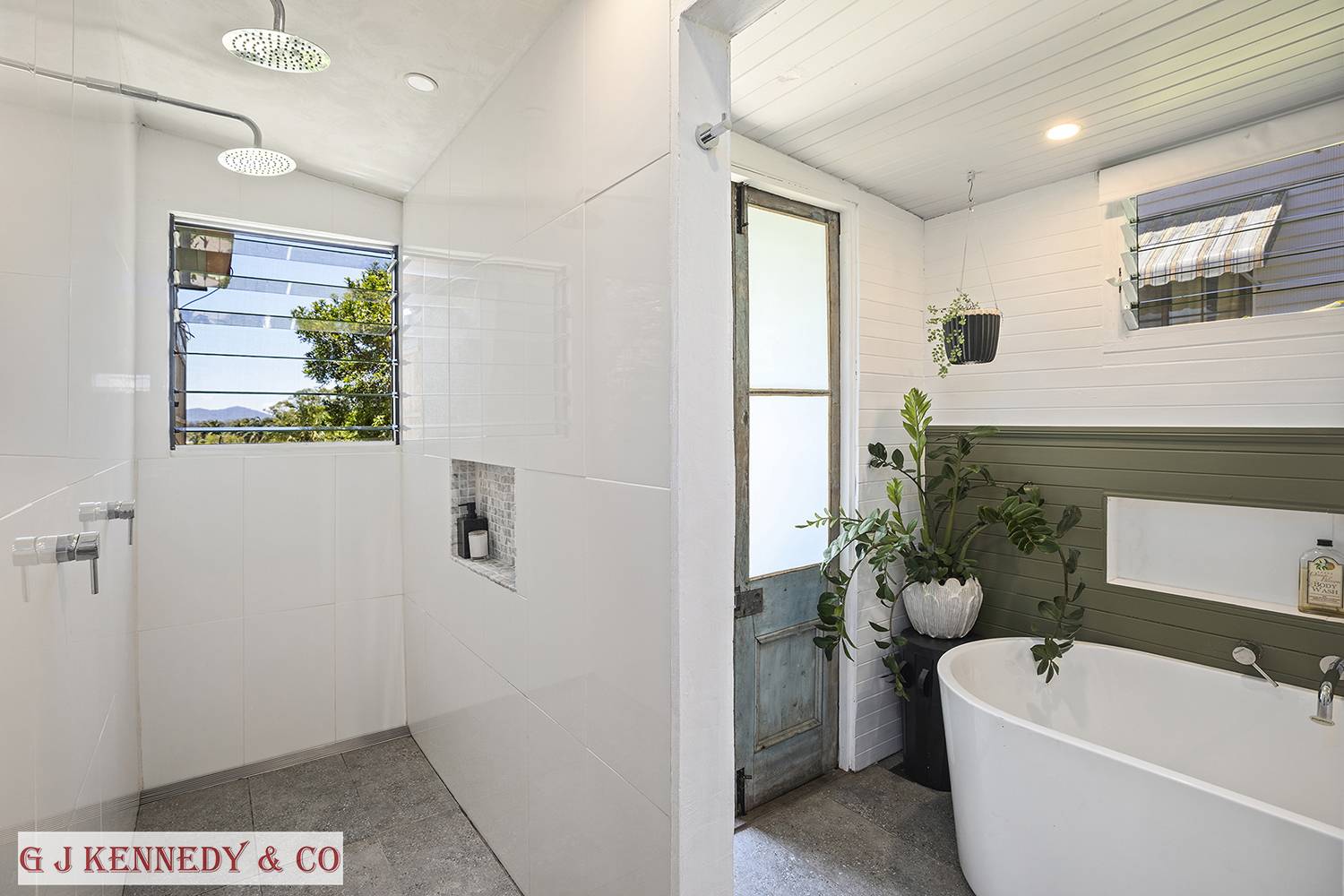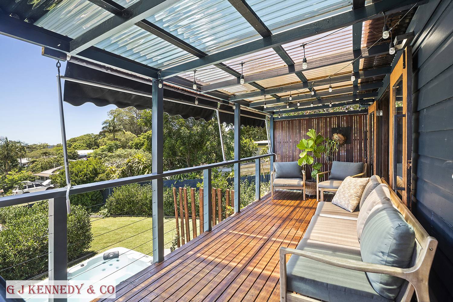 Included is a renovated bathroom with double shower, double vanity, WC and bathtub with a view. Ample Laundry space with machine & dryer. Out the back takes you onto the wide covered deck with stairs leading into the fruitful yard. Manicured gardens abundant with fruit, grapes, limes, avocado, grapefruit, and more.